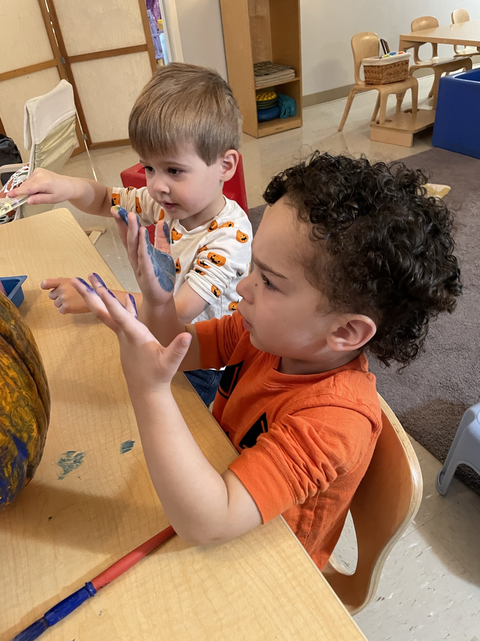 Happy Halloween!!!! We had a spooktacular day today with so many fun adventures! We decided to stay inside on this wet day and explored the Collaboratory. At our group time we used our 5 senses to explore a pumpkin. Some friends were brave enough to touch the slimy insides! I wanted to let the kiddos make all the decisions about what our Jack-o-Lantern should look like. They made suggestions for what shapes and how many to make the face of the pumpkin. We then voted: 2 circles for eyes, 1 triangle for a nose, and 1 smile with teeth! Our group time gave us plenty of opportunities to use our magic words LOOK and SEE. For centers: we played in our haunted house where we practiced trick or treating for tonight; scooped and poured in our sensory table while discussing which pumpkins were real and which were not real/fake; at our creation station we painted pumpkins we brought in or helped to paint our big classroom jack-o-lantern! After all of that we gathered at the carpet to make our friendship snack. It was fun mixing in all the ingredients to make one big bowl of yumminess! We munched and crunched while watching some fun Halloween stories :)