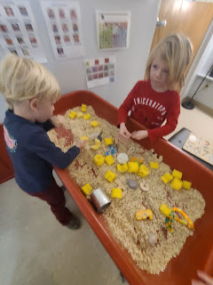 Wait a second, it's not Monday, it's Tuesday! I hope you all stayed warm and had a fun surprise day off! I am excited to report that our friends jumped right back in today with smiles and remembered the expectations and routines of the Pine room. We continue to practice our magic word PUT and our good question word WHERE throughout out play. We explored oats and animals in the sensory table, making conversation about what it feels like, looks like, smells like, etc. We found hidden animal puzzle pieces and PUT them in the right place. We continued our pet shop/veterinarian imaginary play where we discussed how to care of animals and what supplies animals need. Since we finished making our dog house we worked on making collars for our pets! Some friends came up with names for the pets as well.